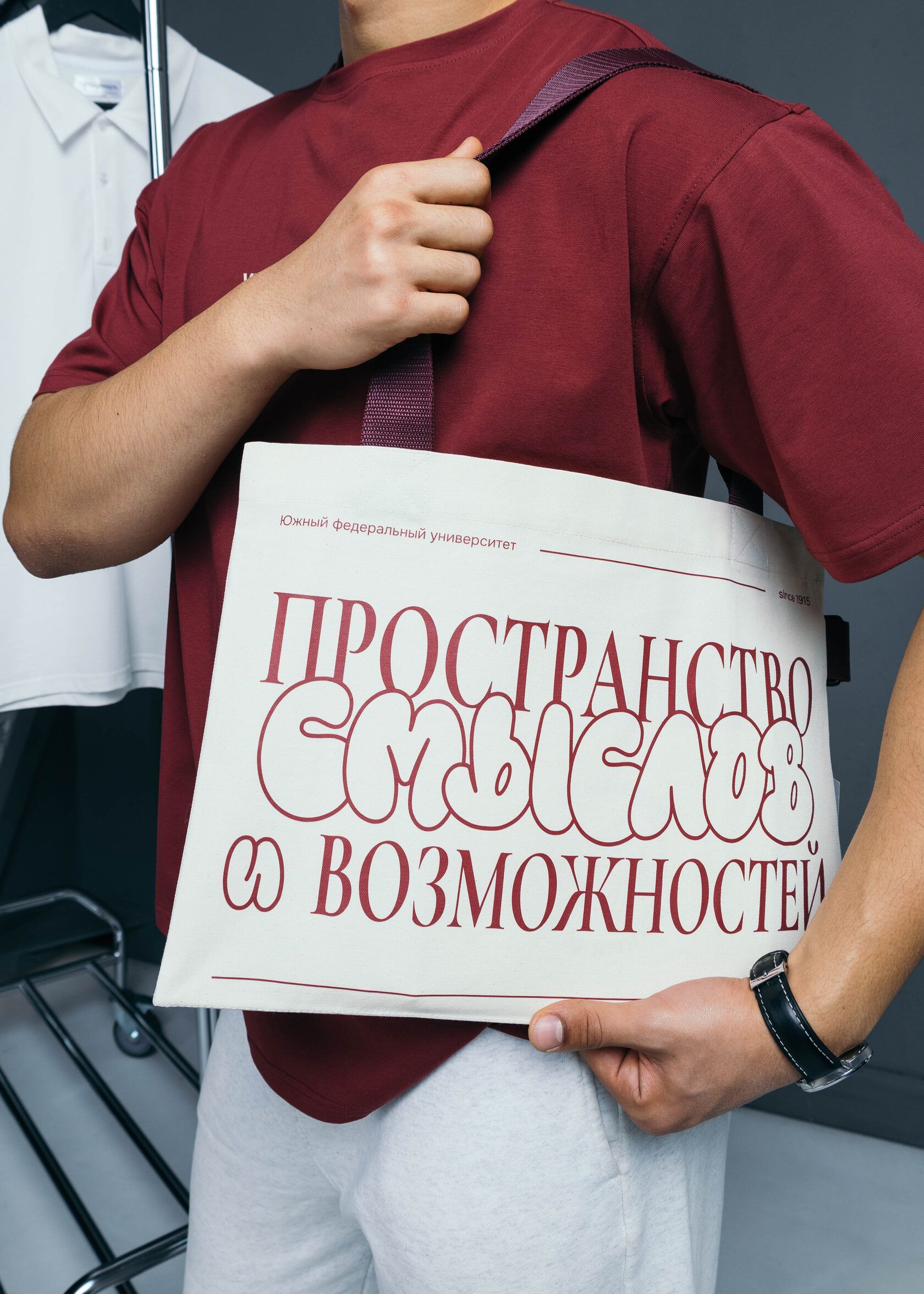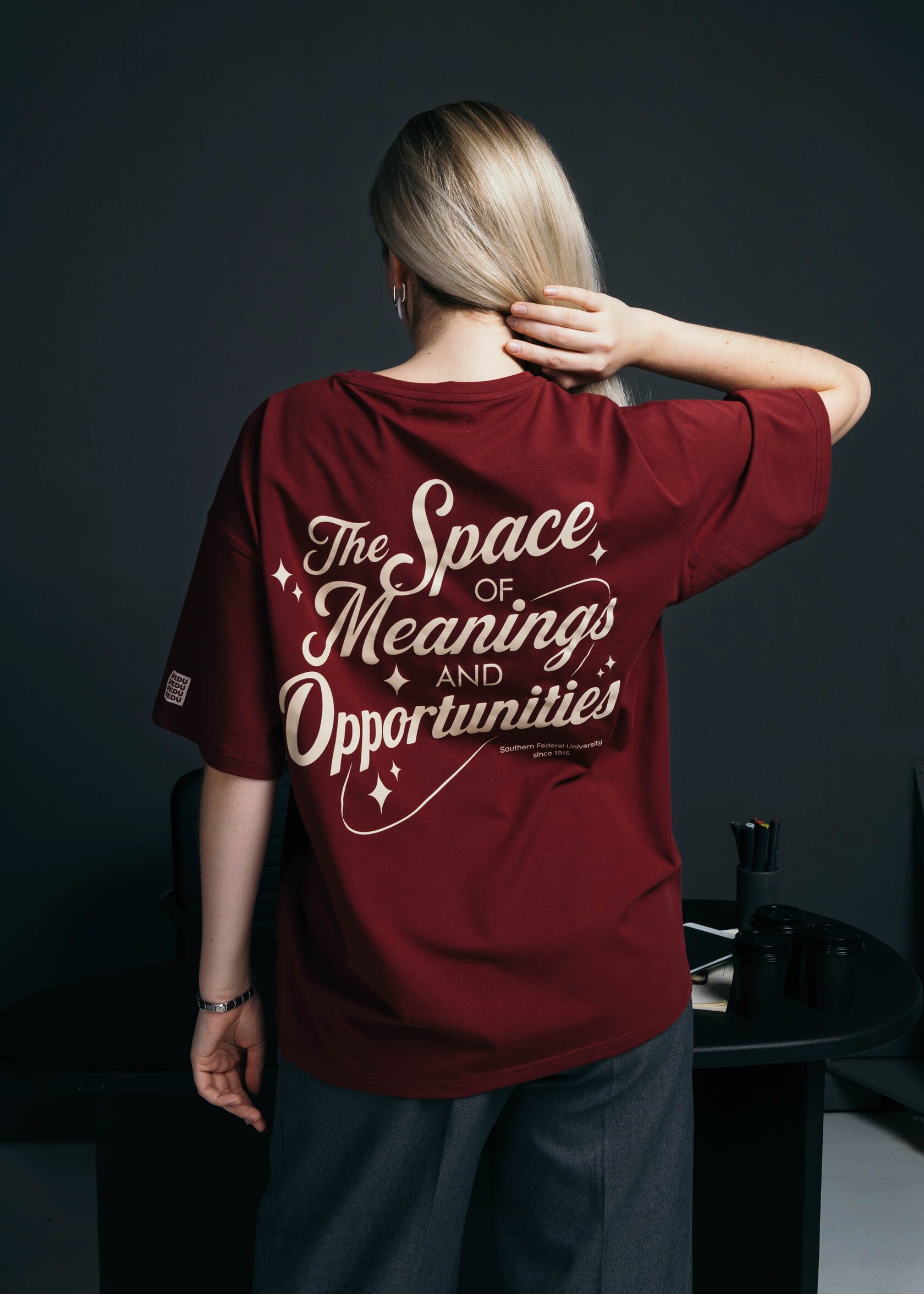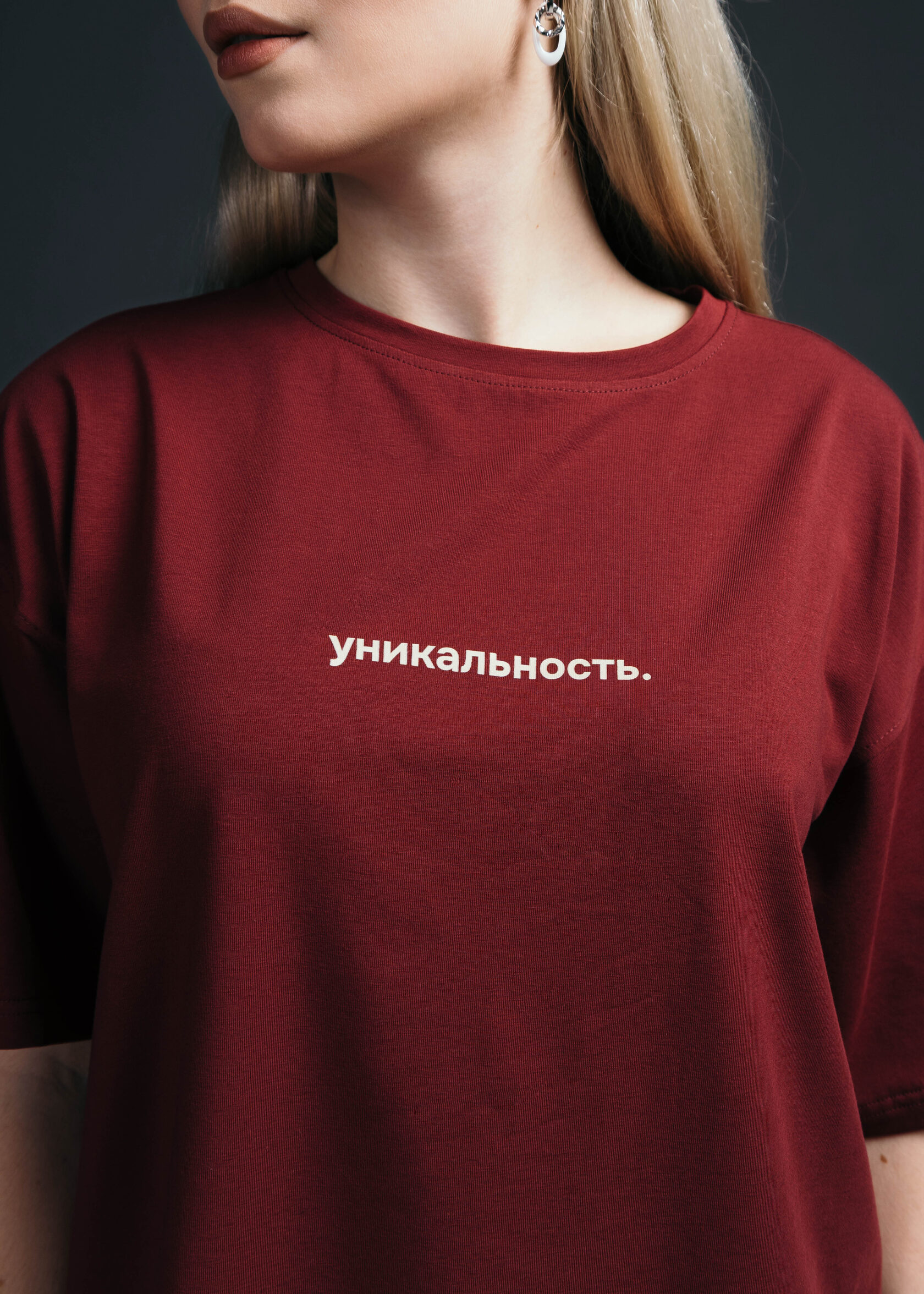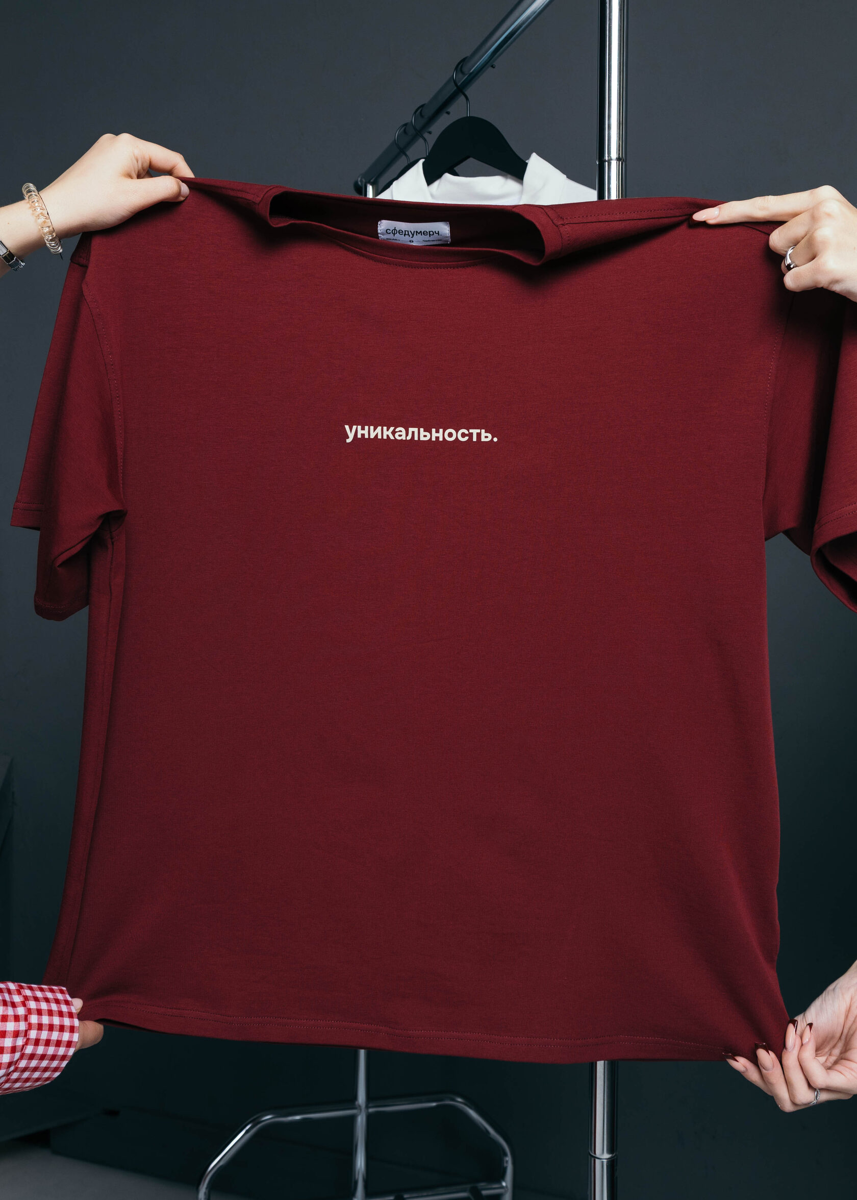 Бордовая футболка, отражающая идею индивидуальности и самовыражения. Почему? Миссия ЮФУ на ней.