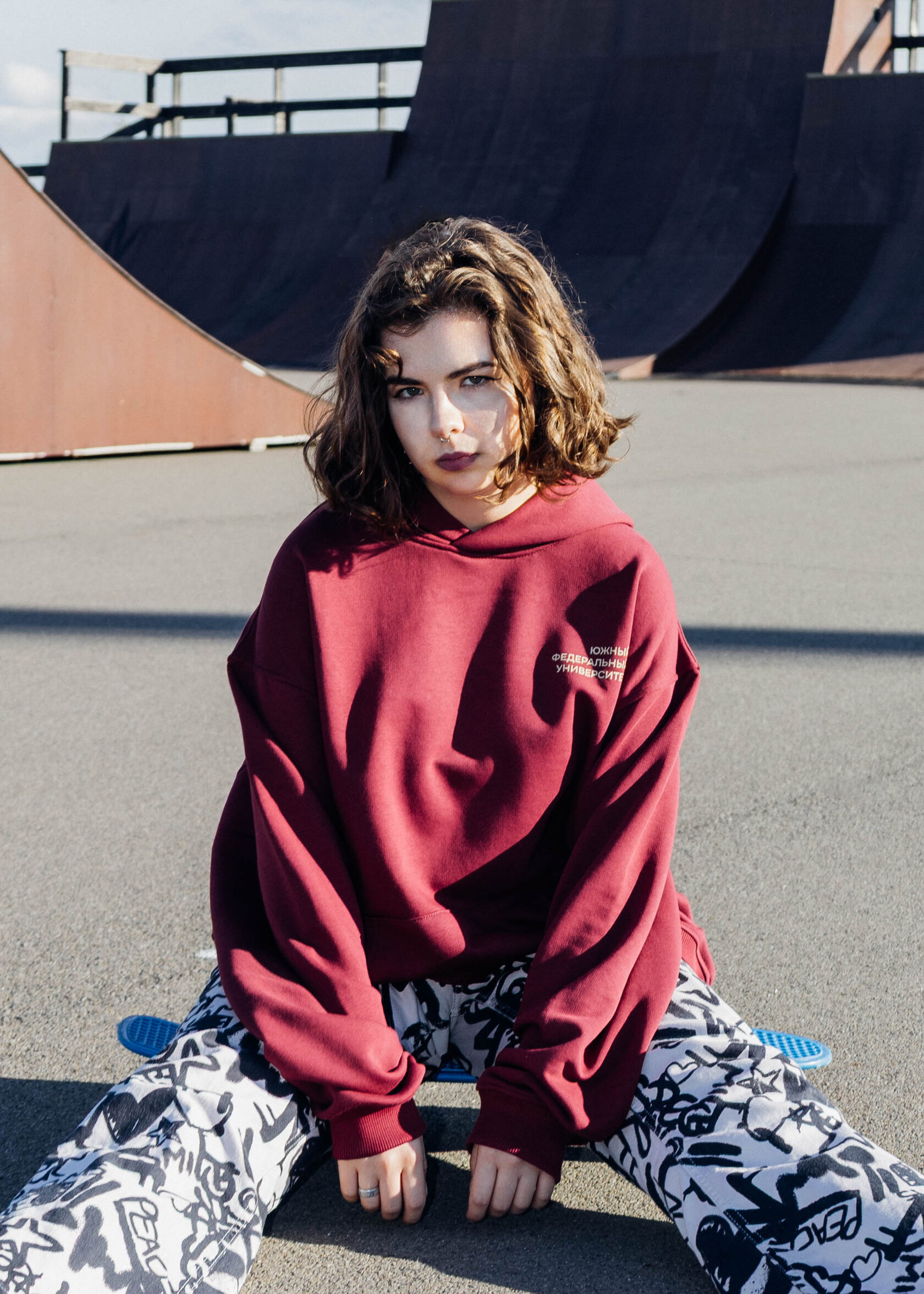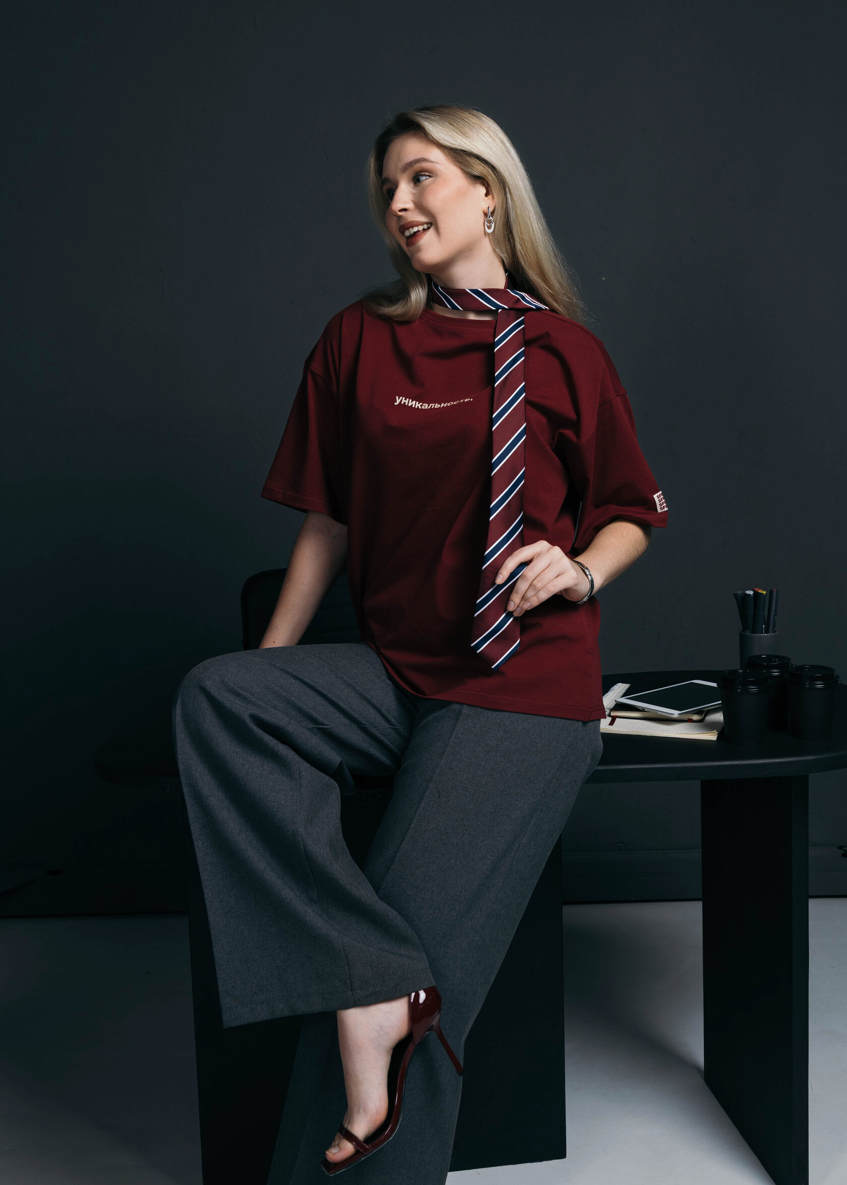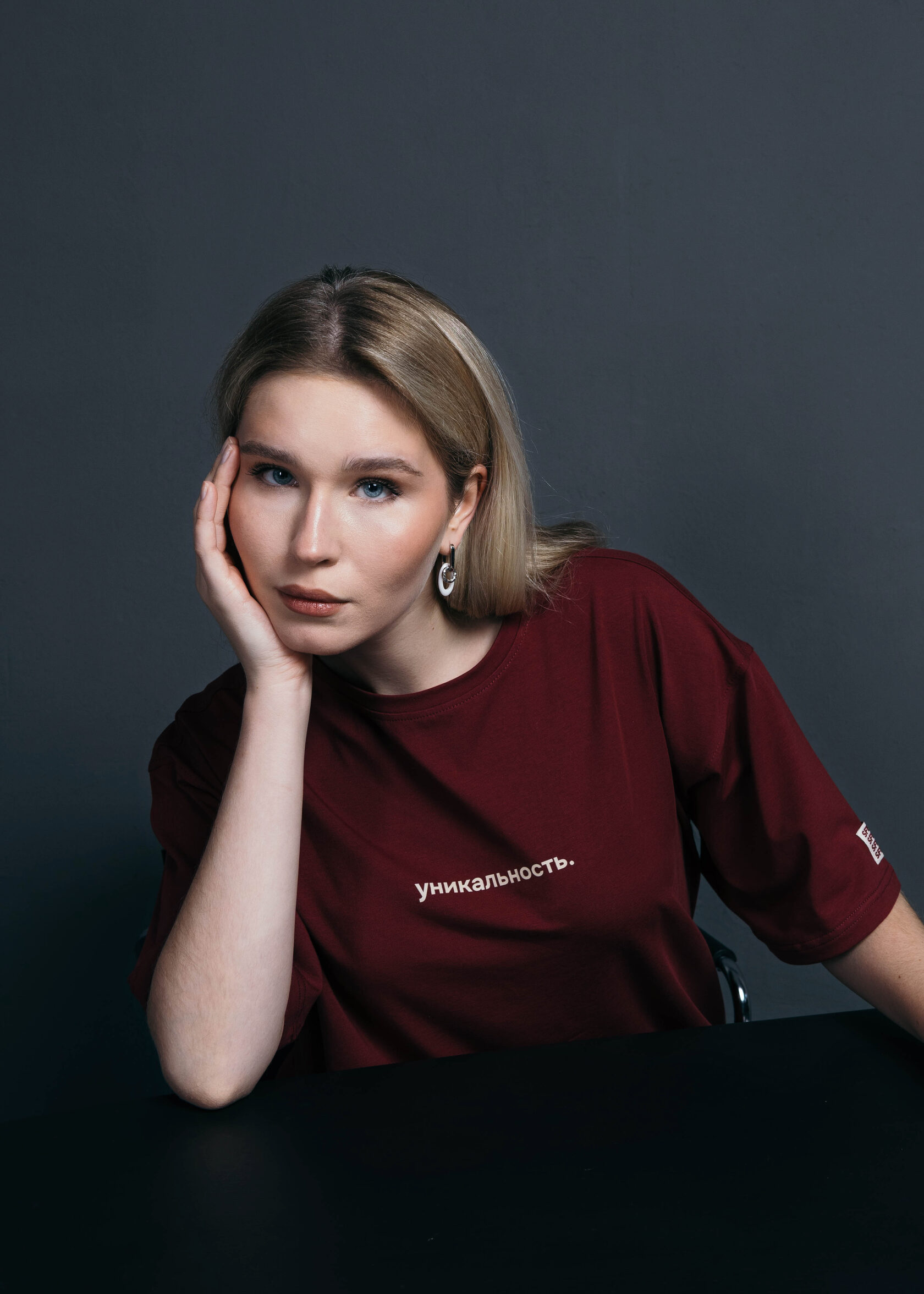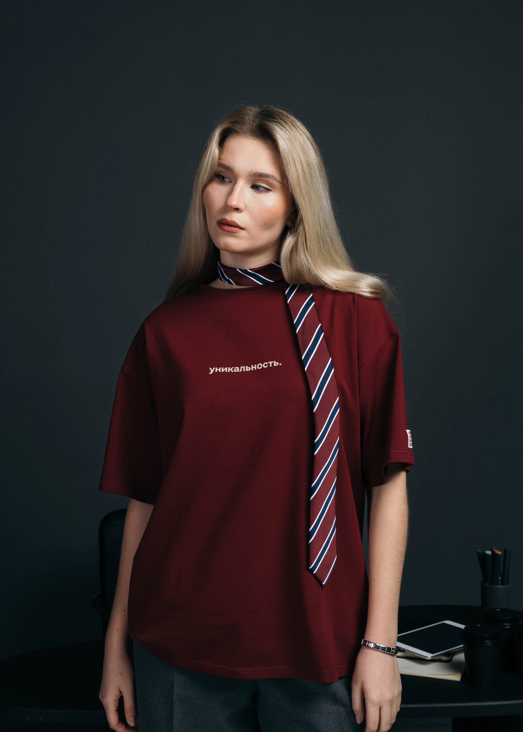 Бордовая футболка, отражающая идею индивидуальности и самовыражения. Почему? Миссия ЮФУ на ней.