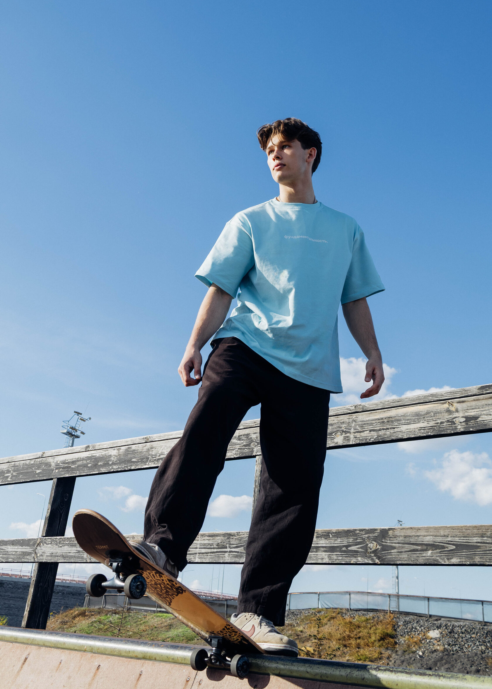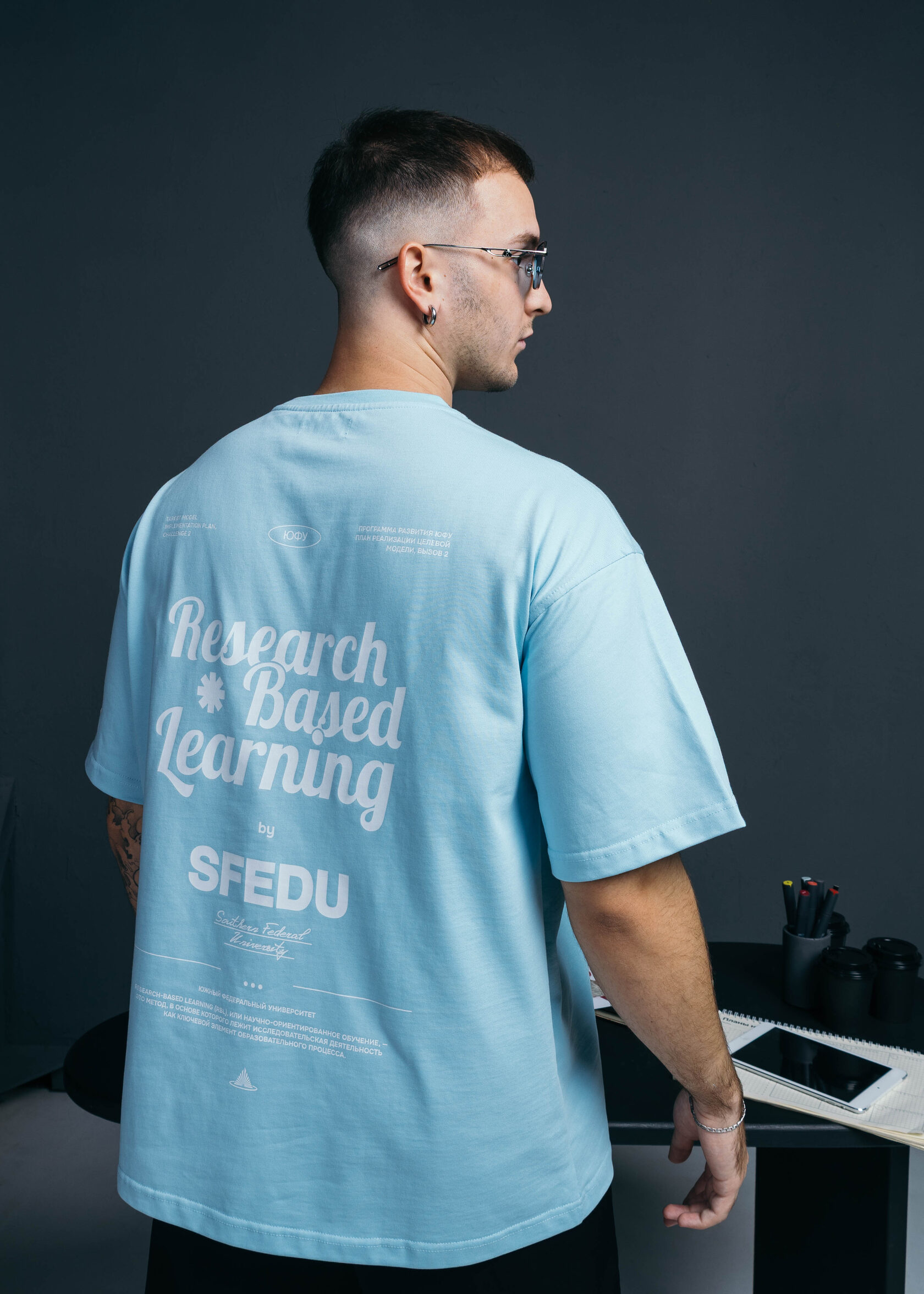 Голубая футболка, вдохновлённая научной основой и устойчивостью знаний.